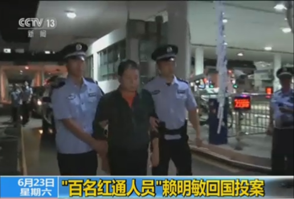 2018年6月22日,中国银行江门分行原行长赖明敏回国投案自首,并主动退赃,成为国家监委成立后首个到案的“百名红通人员”。